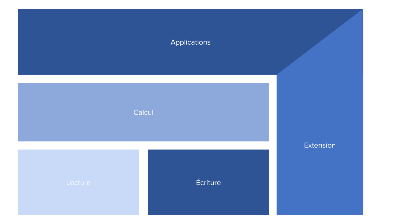 Figure 1 : Lecture : Technologie pour connaître l’état du système nerveux/état neuronal ou de certains aspects de celui-ci. Écriture : Technologie pour modifier l’état du système nerveux/état neuronal ou de certains aspects de celui-ci. Calcul : Technologie pour réguler ou interpréter l’état ou la modification du système nerveux/état neuronal ou de certains aspects de celui-ci. Extension : Technologie pour améliorer et bonifier l’état du système nerveux/état neuronal ou de certains aspects de celui-ci. Applications : Combinaison des différentes composantes du schéma conceptuel pour créer des applications destinées à divers utilisateurs et marchés verticaux.